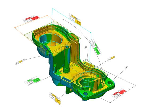 工業(yè)光學(xué)3D掃描儀通過高度精確的3D點(diǎn)云形式,生成實(shí)際加工零件的精確圖像。掃描數(shù)據(jù)不僅可以對特定點(diǎn)進(jìn)行三維評價,還可以直接與數(shù)字目標(biāo)模型(例如:CAD數(shù)據(jù)集)進(jìn)行比較。通過色階可以一目了然地看到偏差,并且可以輕松地定位到錯誤點(diǎn)。